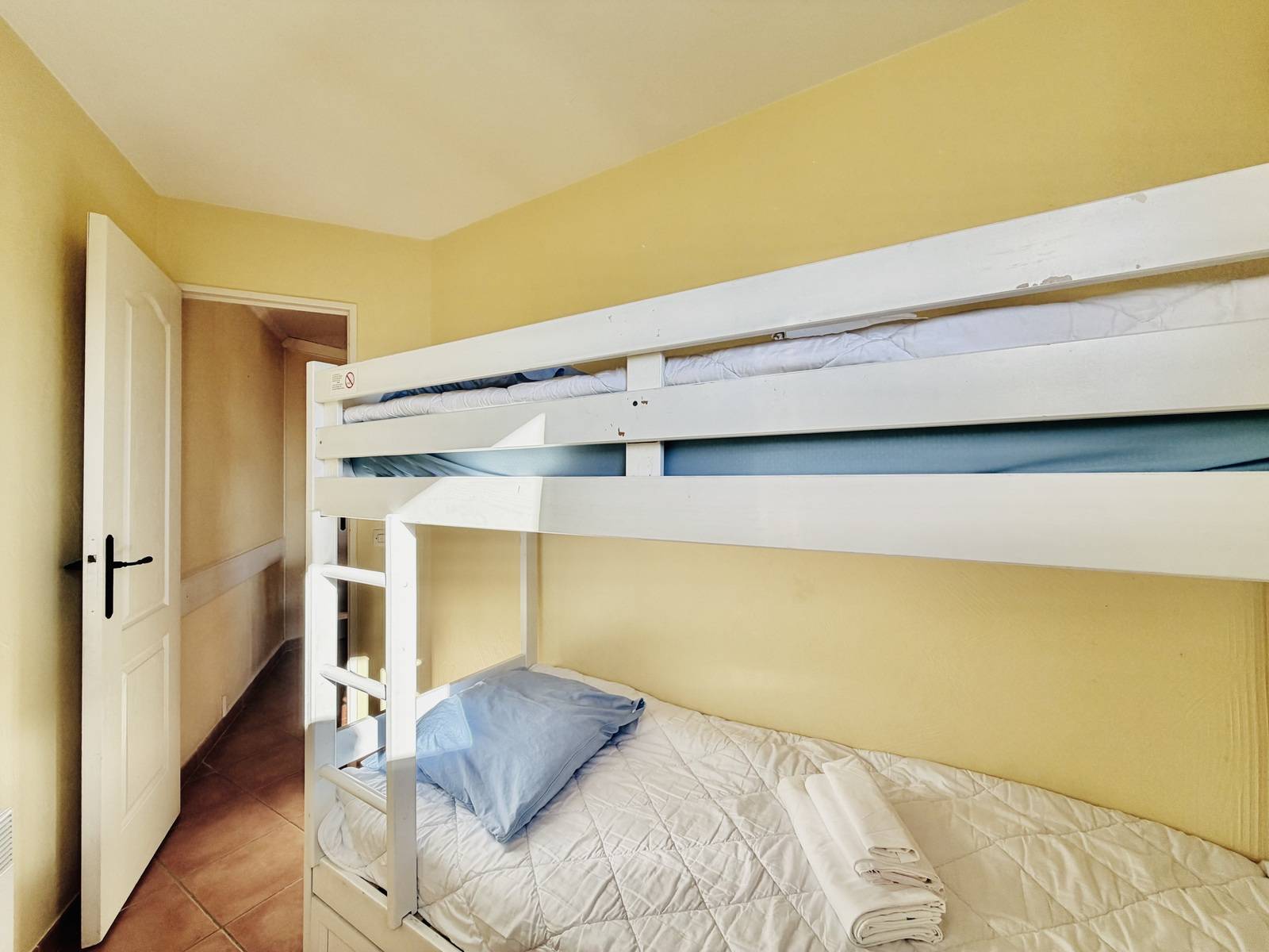 Une entrée, une chambre parentale avec placards, un coin nuit avec lits superposés, une salle de bain, un wc, un séjour cuisine ouvert sur une loggia avec vue dégagée.